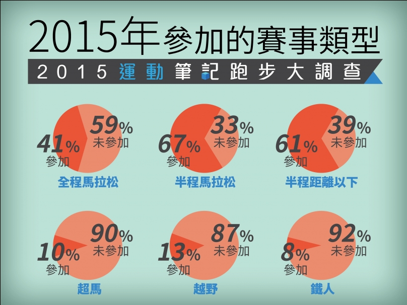 從台灣跑友所參加的賽事距離來看,有將近 7 成的跑友在過去一年中至少參加了一場半馬賽事;而全馬的參加者則相對較少,只有 4 成的跑友有參加。但相對於新手跑者,當然也不乏「跑上癮」的一群人,在所有填答者中,5%的人在過去一年中跑了 10 場以上的全馬或半馬比賽,將跑步視為是生活中的重要活動之一。
