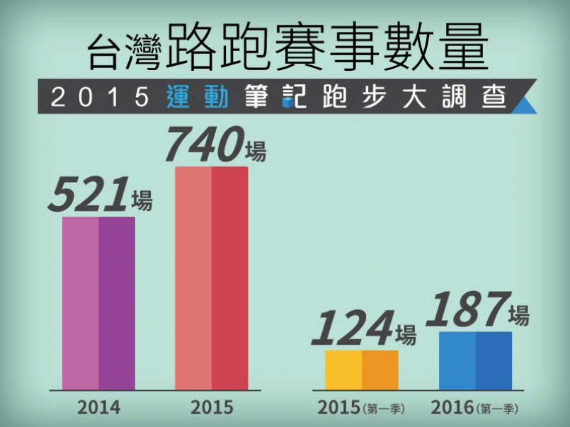 雖然有不少人預估台灣路跑的賽事數量應該已達高峰,但以實際的數字來看,賽事數量仍在持續成長當中。以運動筆記登錄的賽事場次來計算,2015 年的賽事總數比 2014 年多了 219 場,成長了 42%;而若是拿 2016 年第一季(*註1)與去年同期相比,更是增加了 63 場!種種數字顯示台灣跑友參與馬拉松及路跑賽事的熱度不減,風潮仍持續延燒中。