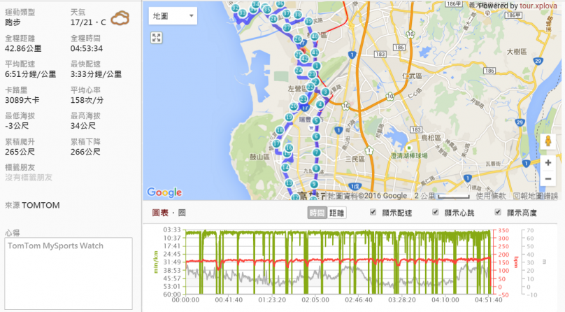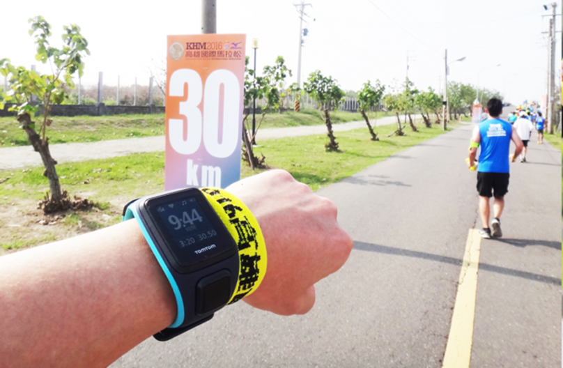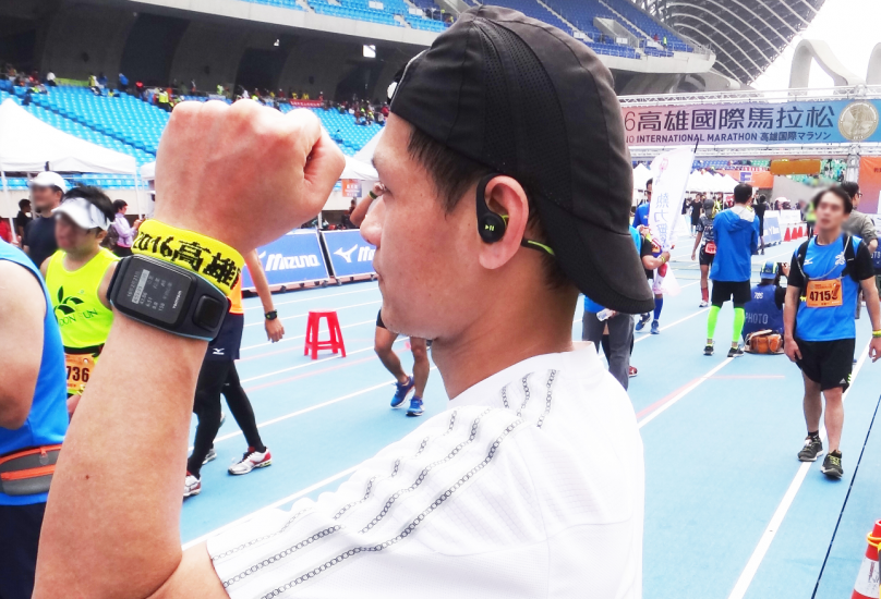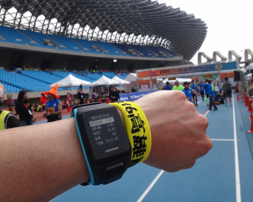 有鑑於 2015 台北馬拉松,大抽筋足足花 10 天兩腳才修復的情況,加上身體稍感不適,靠著 TomTom Spark 監看配速,這一次高雄馬拉松的目標設定在 5 小時內完賽。賽程最後由軍校路轉入世運場館內,在進入跑道內的那一刻,隨著耳邊傳來的音樂節奏感到莫名興奮,沿著彎道看到終點拱門上的計時器,那正是自己的 PB 成績,兩腳踏上感應墊,我跟著音樂節奏完成了心儀已久的高雄國際馬拉松。這一馬沒有累癱,也沒有大抽筋,平 PB 的成績無痛完賽,至於破 PB 就留給下回吧!錶的電力持續到我進入終點後仍有餘電,完賽後關閉 GPS、心率偵測與音樂,直到深夜 12:00 返抵台北時仍可以顯示鐘點。