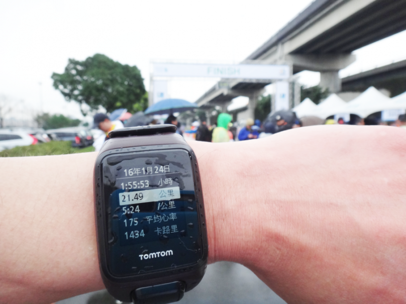霸王級寒流來襲,氣候酷寒,台灣有路跑賽以來頭一回遭逢低溫。清晨 5 點半的台北,天空飄著細雨且氣溫不到 5°C,綿綿細雨加上刺骨的寒風,對跑者而言極具挑戰性。鳴槍起跑後 TomTom Spark 內建的 GPS+GLONASS 雙衛星系統,能在天候惡劣環境下快速定位。狹小擁塞賽道夾雜雨衣磨擦窸窣聲,錶面顯示 9 分速,一路上氛圍少了歡樂與笑聲,取而代之的是專注,跑者們無畏風雨地在寒冬中緩步前進。