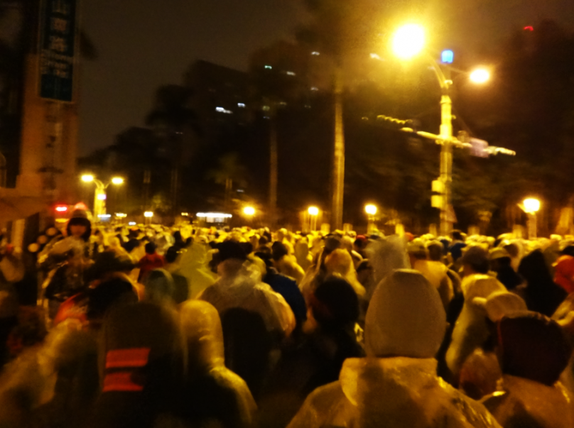 狹小擁塞賽道夾雜雨衣磨擦窸窣聲