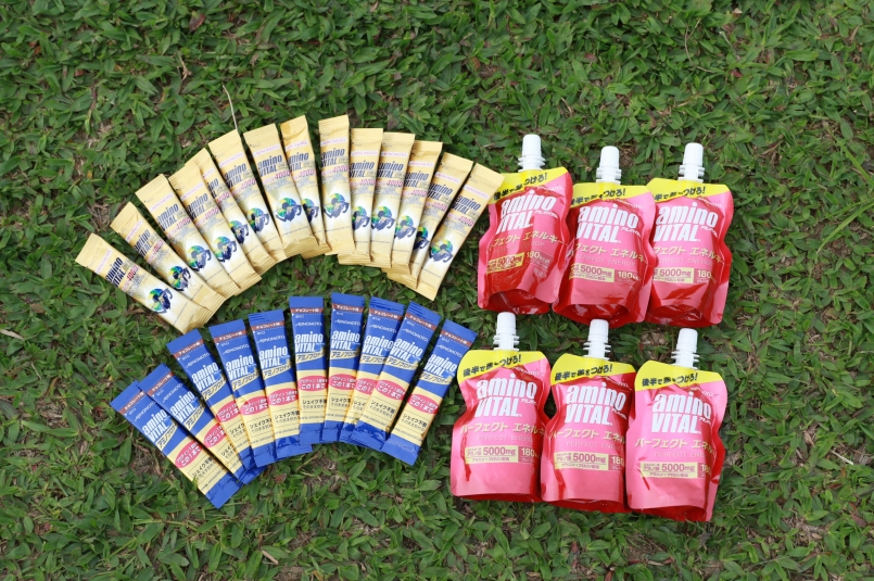 左上:這次的補給滿漢全席是 amino VITAL GOLD 黃金胺基酸、左下:amino VITAL Protein 胺基酸乳清蛋白、右:胺基酸能量凍(圖片來源:Steven Hou)