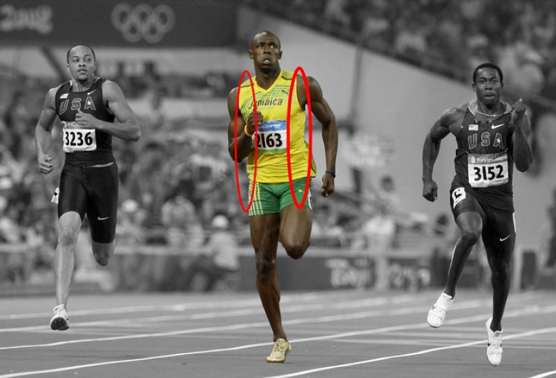 因為衝刺之故,他手擺的垂直軌跡非常大,但幾乎很少有左右水平面軌跡的作功。垂直軌跡的大幅作功是為了提升速度,而幾乎不需要轉髖、在耐力跑上做功課。當跑者衝刺時會發現上下垂直擺動很明顯,而當做長距離練習時的左右擺則會較為明顯(尤其是累了的時候)。