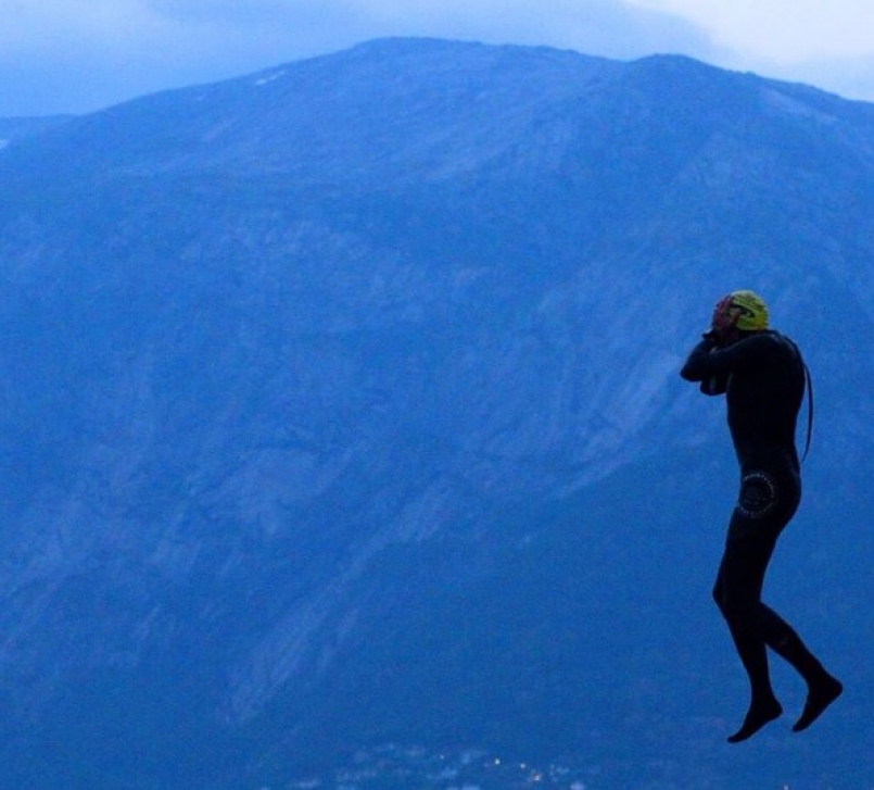 - 從渡輪上跳入夏季均溫攝氏 13~15 度的哈丹格峽灣裡游泳 3.8 km。由於峽灣的上游是冰河,因此氣溫越高,反而水溫越低,因為會有更多的融雪注入峽灣裡降低水溫。