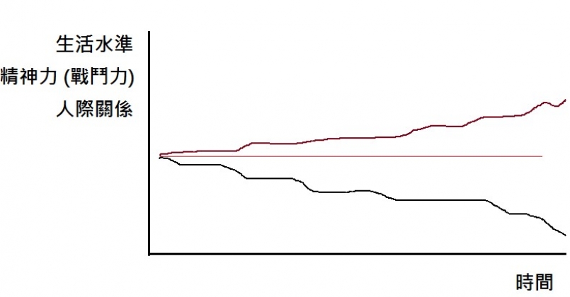 曾經聽過這樣的說法: 如果人什麼都不做,隨著時間流逝,生活與各種大小狀況會像下圖黑色線一樣往下掉,不會像紅線一樣筆直走到盡頭。相反的,我們一定得要有所付出,才能像下圖酒紅色線一樣使生活水準、體能、人際關係或是小確幸保持向上,或至少不要往下掉。