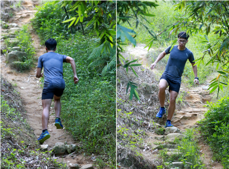 起跑先由木棧道接公路和石階下坡,約 2 公里,保持輕快的步伐於隊伍後方壓隊,整段跑下來穩定性不錯;2-6 公里處會接到觀音山鷹仔尖和北橫古道,最後再直上硬漢嶺,地質為泥土地、岩石和小碎石,地勢則多半為需要拉繩索的極陡坡,偶爾穿插短暫的下坡點綴。