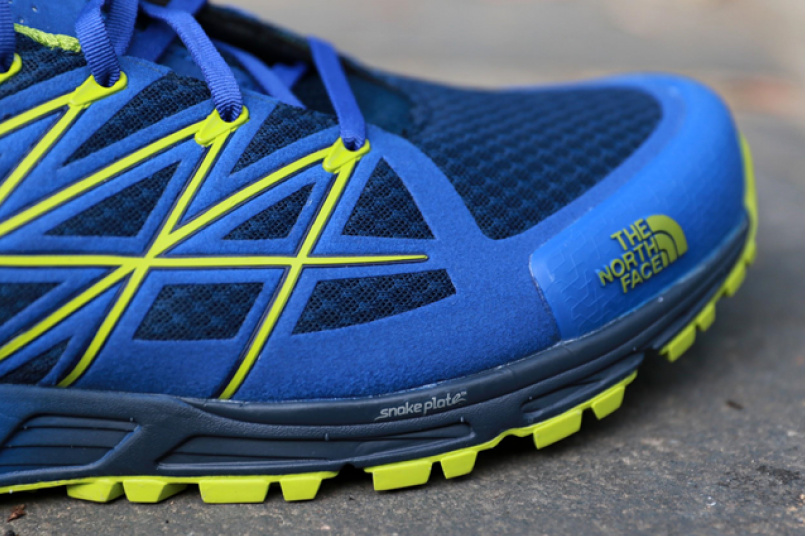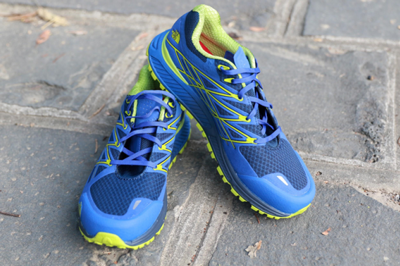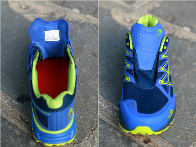 男鞋 9 號的單腳重量約為 11 oz(313 g),前後腳 drop 為 8 mm。第一印象感覺厚實感鮮明,應是保護性很強的鞋款,外型設計帶著和其他 The North Face 的越野鞋款一貫的影子。底色為宇宙藍,並用鸚鵡綠勾勒出線條感,在「先求帥,再求快」的最高指導原則之下,算是合格!