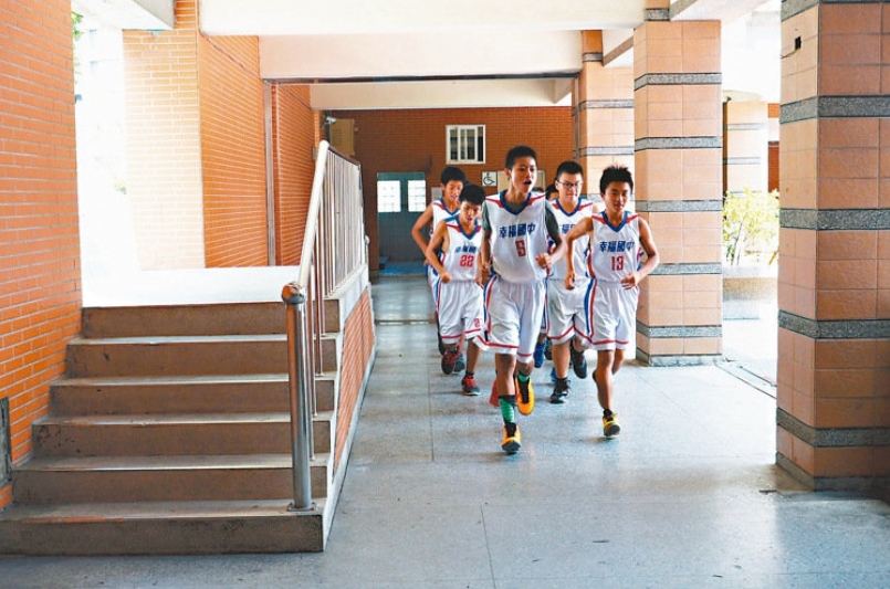 幸福國中沒操場,張宗樺(右前)等人如果要在學校練跑步,只能利用走廊,還要閃避障礙物,以免受傷(圖片來源:記者施鴻基攝)
