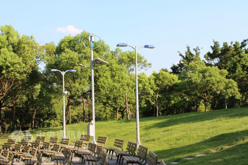 台北市府工務局在大安森林公園音樂台座位區,裝設1 盞風力太陽能路燈,還有 2 組USB充電座,提供民眾補充手機等電子產品電力(圖片來源:台北市工務局提供)