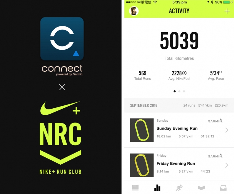vívosmart HR+ 能自動上傳資料至 NIKE+,若看到 NIKE+ 活動紀錄出現 Garmin 圖示,代表資料自動同步成功(圖片來源:紀薇)