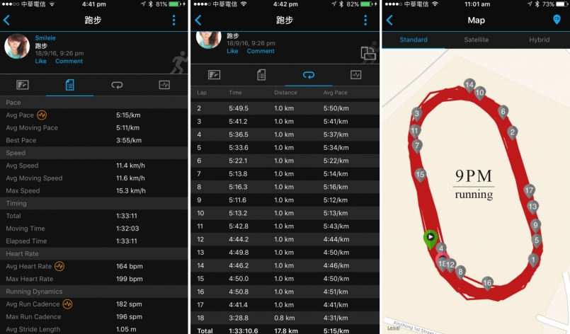 每天最喜歡的活動就是揮汗奔跑的時刻,這天輕鬆跑了長距離,之後查看 GPS 軌跡還算精準(下圖右),不太有飄移的情況,而定位速度在空曠處、有遮蔽物處等地點測試後也都能於 1 分鐘內完成。