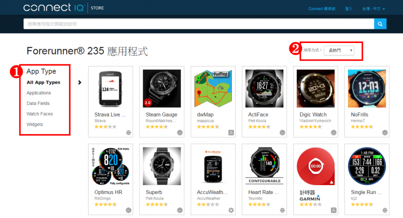 更便利尋找應用程式可以運用以下 2 個搜尋與排序:應用程式分類、熱門/最新/最高評價(圖片來源:Connect IQ™ STORE)