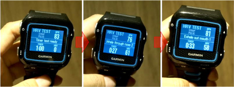 什麼是 HRV 呢?心率變異度(Heart Rate Variability),它是測量自律神經系統對於心率的控制度,變異度愈高代表調節能力愈好,對於跑者來說 HRV 的高低也是訓練時身體狀況的一個指標。現在也有很多手機 app 有提供 HRV 測量,但 Garmin FR 920 XT 或 Fenix 3 可以直接從 Garmin Connect IQ™ 下載 HRV 應用程式,更為方便。你只要站著約莫 1 分鐘左右,跟著錶面的指示,用鼻子吸氣 3 秒、嘴巴吐氣 3 秒、休息 3 秒,反覆 1 分鐘後即可測量到數據。參考延伸閱讀教練徐國峰的文章,紀錄練習前後的 HRV 指數,觀察其差異可避免訓練過度的情況。