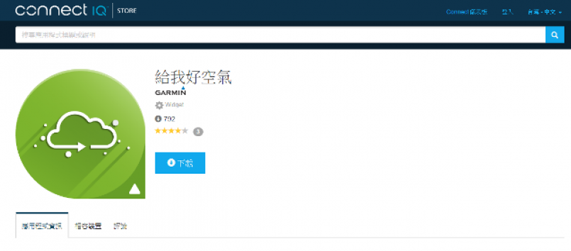 提供 2,900 個監測站的空氣品質等即時資訊的給我好空氣 Widget(圖片來源:Connect IQ™ STORE)