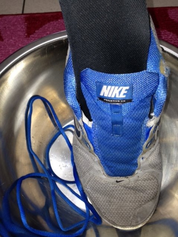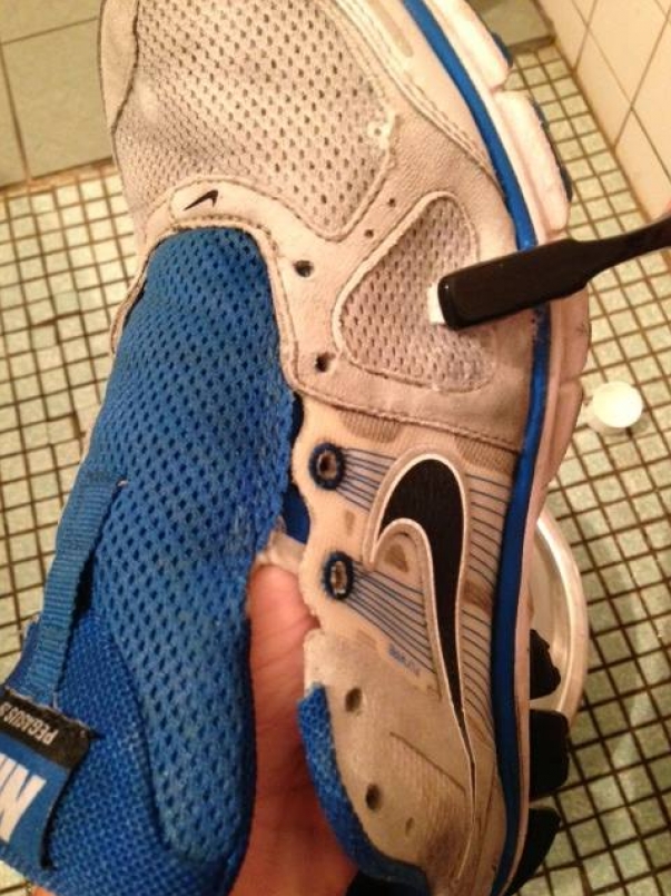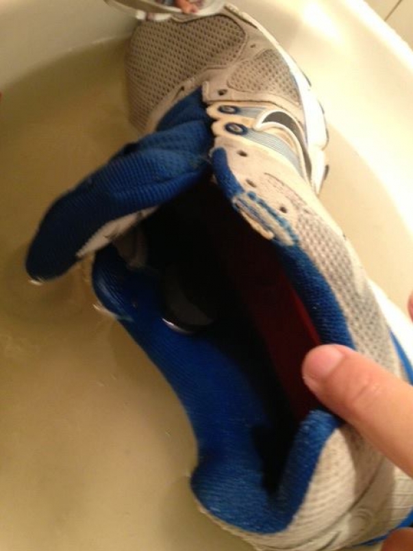 若是您的跑鞋已經開始發出異味,或是已經黑到不行(如圖示),或是已經洗過但一穿去運動又有一股臭味,那麼使用 sport wash 搭配適量清水將您的跑鞋徹底清潔是您再岀發訓練前所最需要做的一件事了。