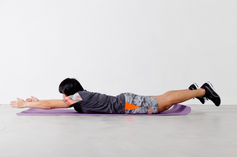 - 面朝下趴著,雙手雙腳向前、後延伸