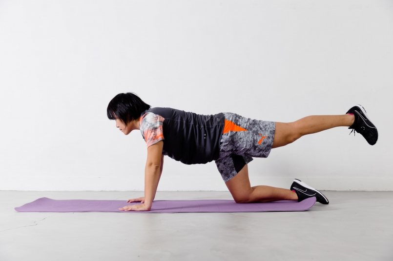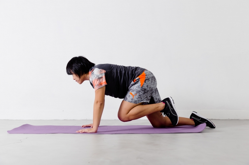 - 像往後踢東西一般,將一隻腳向後延伸,而後將膝蓋縮回身體下方