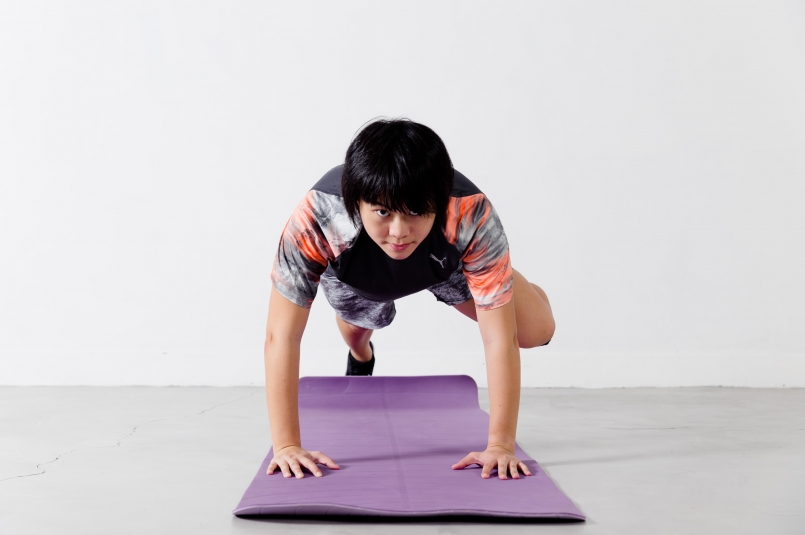 - 呈伏地挺身準備動作,手掌撐於地面,保持手肘微彎,讓上半身肌群一同參與