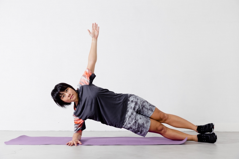 若側棒式行有餘力,可以來試試看由其所延伸出的變化型,加上一個將手迴旋至身體下方的動作,操作時保持呼吸,且不用求快,感受因旋轉動作而帶來更多的不穩定,讓核心肌群有意識的控制身體平衡。