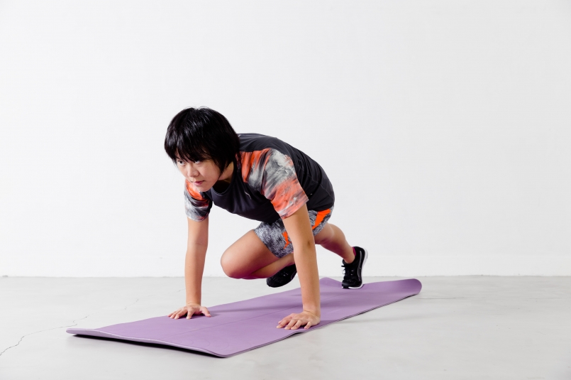 登山式亦是由棒式所衍伸出的動作,以雙手手掌撐於地面,保持核心穩定之餘,將雙腳交替向前。不過這次操作的為另一種較著重是側腹肌群的動作,一樣是雙腳交替向前,但是是往對側手移動,右腳膝蓋往左手前進、左腳膝蓋往右手前進的方式進行。