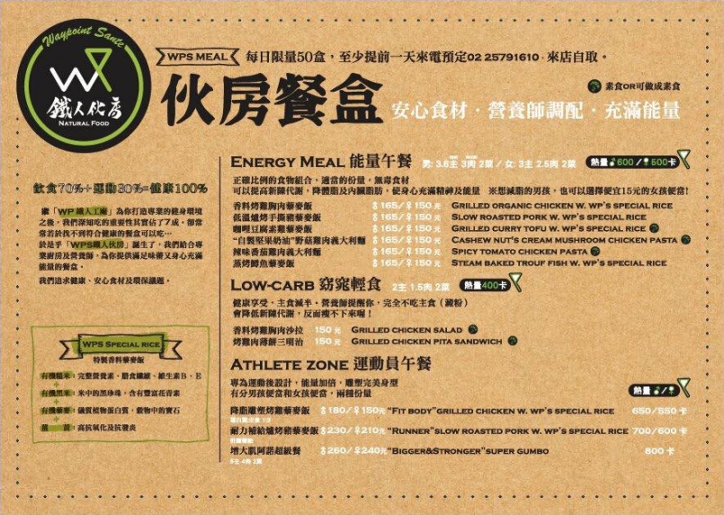 每一份餐點中的營養成分比例也都經過計算,豐富佳餚熱量也在控管之中,份量適中,優質蛋白質的比例份量讓人不會覺得不飽足。也提供伙房餐盒,使用安心食材以及有著均衡的營養成分,可以在外食之餘依然享受健康的餐食。