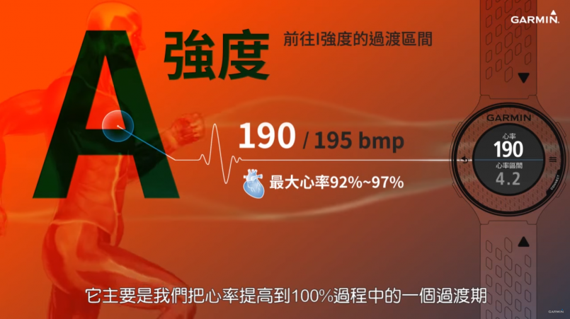 A 強度,沒有特定訓練目的,是將心率提升到 100% 的過渡期(圖片來源:Garmin Taiwan)