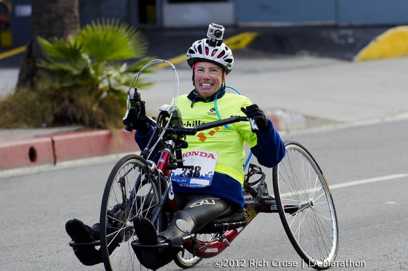 已經 62 歲的 Beth Sanden 自 2002 年以來已經完成 50 場馬拉松和 48 場鐵人賽,聽起來是位熱愛運動的老人家。不過也許你不知道,2002年 Beth 在騎自行車時出了一場意外,從此下半身癱瘓,右腳還有一點感覺,左腳則是完全不管用,這麼多場比賽都是靠一輛特製的手動三輪車完成的!