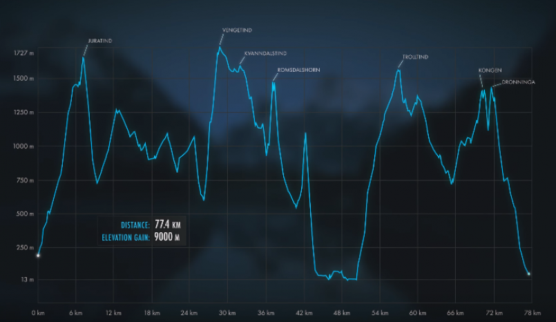 越野超馬之王 Kilian Jornet 最近有個新挑戰,就是在 24 小時之內爬完他家後面的七座山峰,這七座山峰說遠不遠,總距離才 77 公里,對 Kilian 當然不算什麼,不過加上總爬九千公尺,相當於 10% 以上的坡度,以及大部分是白雪覆蓋的地形,那可就是一大難事了,看看這精美的高度圖: