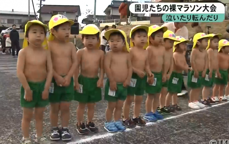 最近有則日本的新聞,就真實反應出兩國對小孩教養態度的不同。在日本中人吉市,前陣子舉辦了一次小朋友的路跑賽,距離不長,最多就跑個 1 公里。但是有一點不一樣,參加的孩子每個都是赤裸著上身!難道日本小孩不怕冷?影片中每個小朋友可都在簌簌發抖,但是沒人大哭大鬧。所有的大人都在沿途幫孩子加油,雖然有小朋友忍不住掉淚了,但還是努力跑到終點。當天天氣晴朗,但是氣溫只有 4 度,看旁邊大人的穿著就知道絕對是冷颼颼。