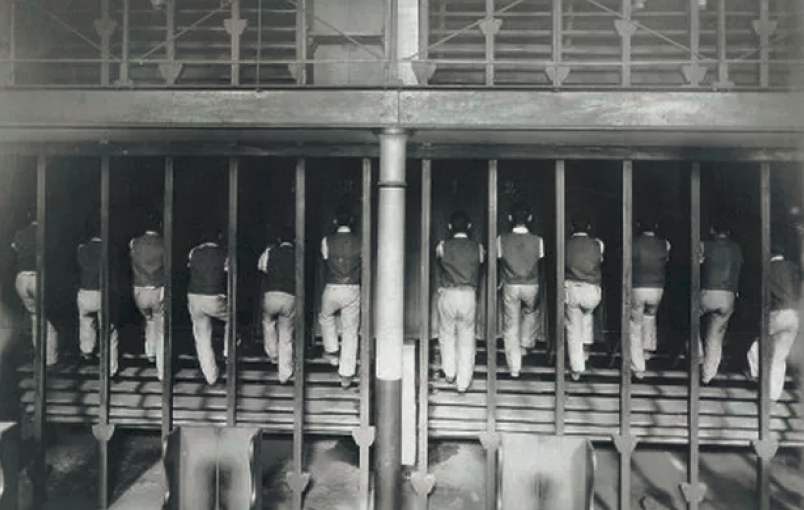 一開始的跑步機其實比較像現在的爬樓梯機,犯人們合力踩動一個很大的圓柱,圓柱則透過重量賦予不同的阻力。當時的訓練,更正,應該說是懲罰,有多慘呢?根據一些歷史文件記載,當時的犯人一天要踩的量相當於 6 小時內垂直爬升三千到四千公尺,甚至曾經有在炎夏讓犯人整整踩了 10 個小時,等於爬升五千公尺的紀錄。