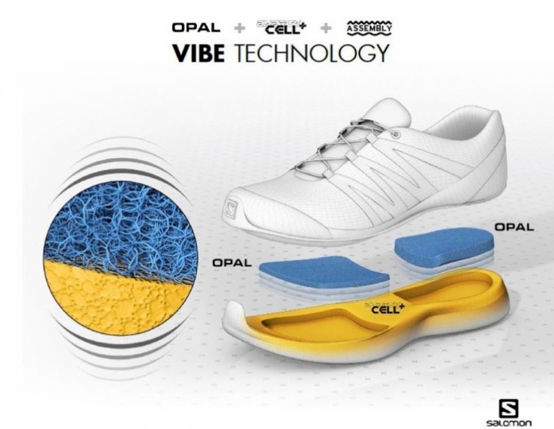 厚實的中底蘊藏複合式中底-VIBE 減震緩衝科技,以上一代的中底 Energy Cell+(合成EVA)+ 全新的 Opal,是今年 Salomon 的全新科技,訴求"先緩衝後回彈",有別於傳統跑鞋的單一被動吸收的能力,VIBE 在緩衝的功能中更強化了「減震性能」,能縮短落地瞬間的震盪,再將路面回饋的反作用力轉化為推進的力量,延長整體運動表現。