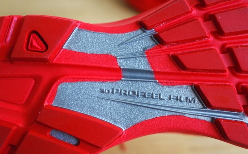 3D PROFEEL FILM 彈性支片於鞋底中橋位置,以薄薄一塊的立體 TPU 膠片組成,支撐鞋底不易產生橫向扭曲,並提供腳掌疲憊時的穩定性和前進方向。