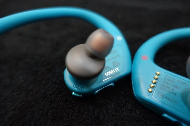 Sony Walkman NW-WS623 藍牙隨身聽耳機,每一個功能按鍵皆有不同的刻紋與觸感,操作上明確清晰。(照片來源:吳俊毅)
