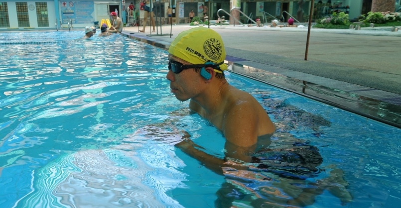 戴上 Sony Walkman NW-WS623 與泳鏡貼合,享受水中的音樂世界。(照片來源:吳俊毅)