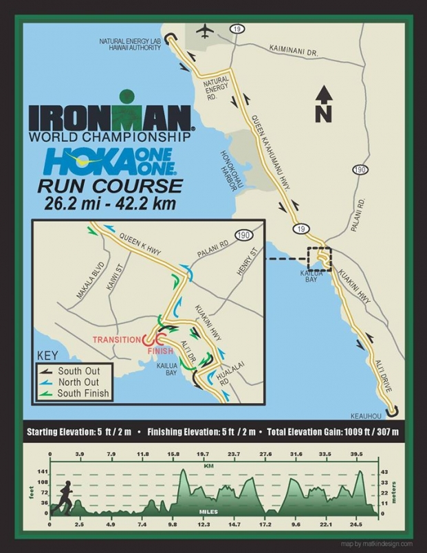 而目前 KONA 決賽的賽道主要都是在夏威島的西邊舉行,騎車與跑步賽道都會沿著或是利用西邊的”Queen K”高速公路。路線其實也不平坦,上上下下的非常考驗選手的腿力。