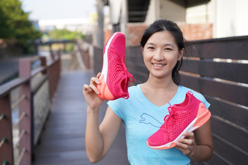莎莎著用 PUMA IGNITE XT NETFIT,甜蜜的桃色系適合女生著用,舒適的 IGNITE 中底讓她感受到不同以往的舒適腳感,當然,可以任意且自由改變風格的鞋帶科技,也讓莎莎愛不釋手。