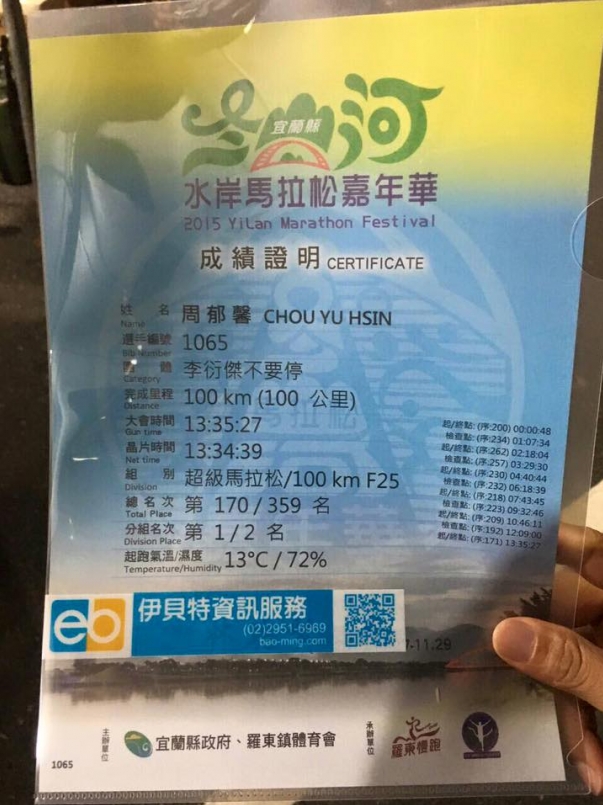 2015年成功挑戰冬山河100KM 超馬(圖片來源:Chris Chou)