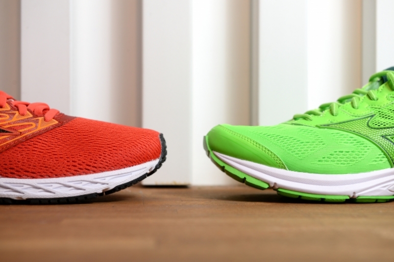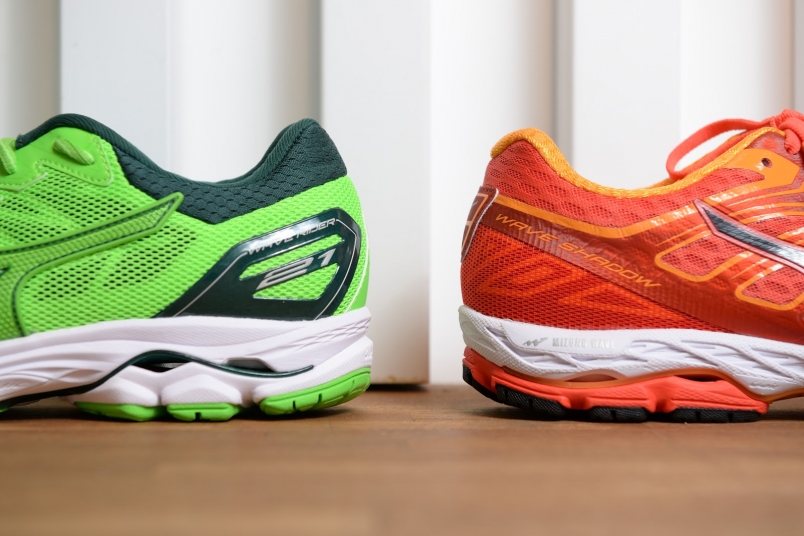 而以慢跑避震鞋 Rider 21 與 wave shadow 做比對,Rider 21 不僅整體厚度比 wave shadow 來得更厚,前後掌的高度差也比 wave shadow 高,因此避震與緩衝機能更好,也適合從入門到中階跑者、以及需要較充分緩震的跑者需求。