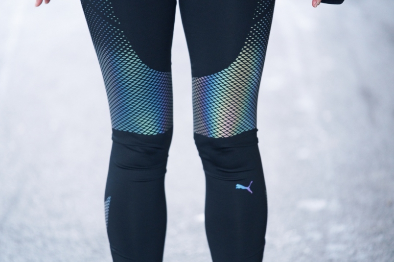 至於下半身則是搭配和雨天同款的 NightCat 反光運動緊身褲,使用高彈性科技加壓布料, 給予腿部肌肉強勁支撐與保護,表面也設計防水塗層,而且褲管上的虹彩反光材質還會隨著光線和角度而變化;在光線充足的環境下,反光材質就像是一般平常的紋路,但到了陰暗的地方,卻會隨著移動的角度顯現出七彩般的光澤,穿上它絕對會讓和你一起練跑的人眼睛一亮,大呼:「快跟牛魔王出來看彩虹啊!」