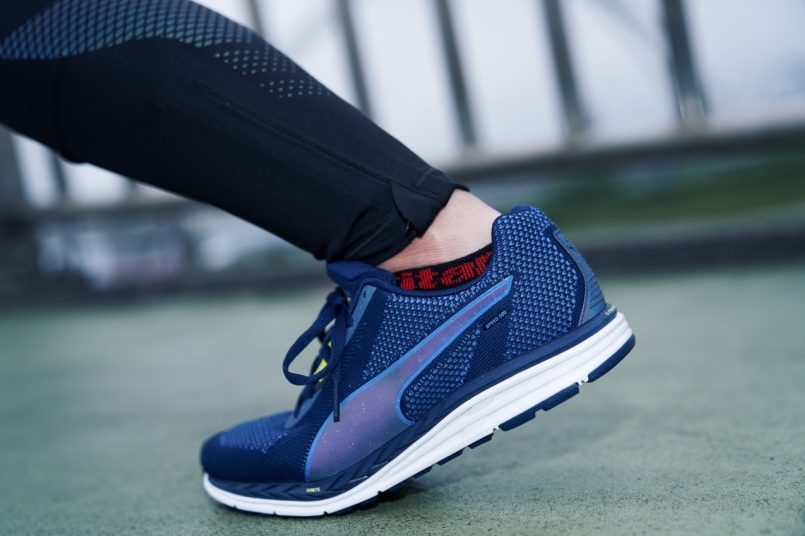 這次體驗的 PUMA IGNITE SPEED 500 正是一雙為了對抗雨天而設計的鞋款,它和 Night Cat 系列緊身褲同樣具備防水科技塗層,加上獨特 evoKNIT 編織鞋面兼具了輕量與包覆性,不用擔心跑鞋有防水功能就會像雨鞋一樣笨重,可以輕盈又舒適。
