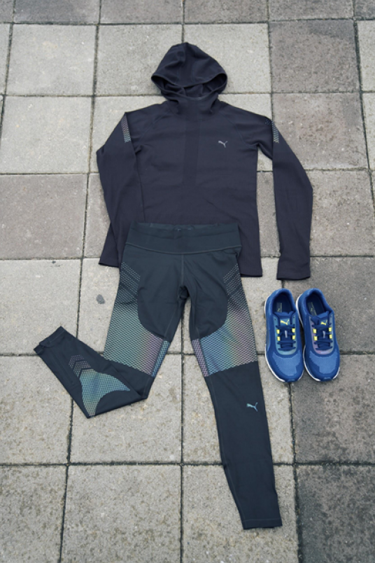 冬天的夜晚來得特別早,即使六點準時下班,外頭的天色也早已全黑,所以夜間訓練時的保暖和安全性就顯得更加重要了。夜晚時的裝備,上衣挑選的是一件長袖連帽T恤,它的 3D 無縫編織技術,符合人體工學設計,提供舒適的穿著體驗,還兼具保暖及舒適排汗的功能,而且雖然是深色的,不過手臂兩側的反光設計,可以同時兼顧帥氣和夜跑的安全性。