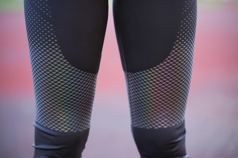 在夜裡受到光照時所反射出的彩虹光;此外,我也很喜歡這條褲子的高腰帶設計,穩定包覆腹部肉肉,減少晃動,細緻的縫線也減少皮膚與褲子間的惱人摩擦。(圖片來源:運動筆記 / Mirada)