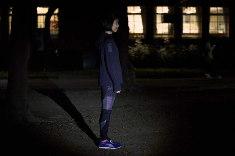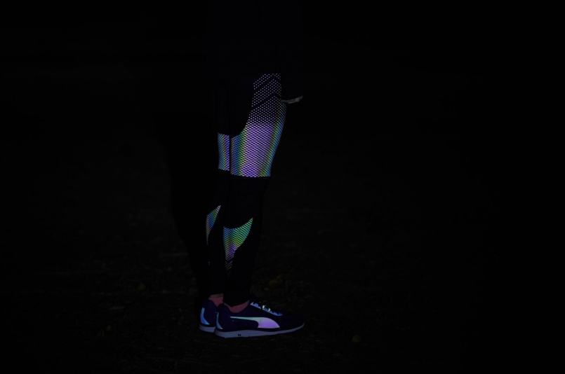 還有阿!女孩子嘛!無論年紀,不管出席甚麼場合,都會想穿得漂亮一點吧!跑步運動也不例外,像緊身褲就經常都是黑色,常令人感到單調,但 NightCat 在反光時透出來有不同虹光顏色,反光物料覆蓋跑衫兩袖、外套及緊身褲大腿位置,大大增加反光效果。