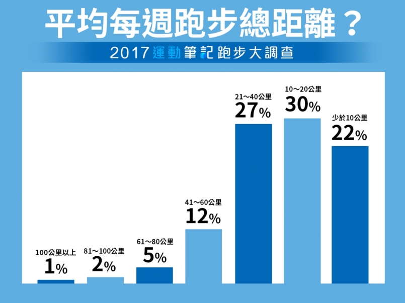 此外,值得注意的是每週練跑量少於 10 公里為 22%,相較 2016 年成長了 4%,可能是有更多新手跑者加入跑馬行列。