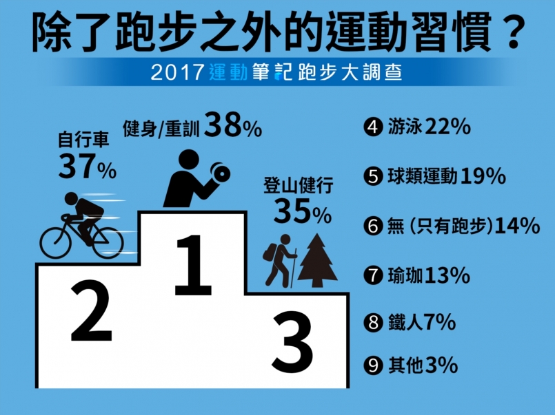 另一部分, 許多挑戰三鐵賽事者是從跑步作為開端,因此,除了跑步還從事自行車(37%)和游泳(22%)運動的族群看來不算少數,想必這正是近幾年鐵人賽事翻倍成長的主因。另外,登山健行需要體力,所以會以跑步作為訓練;而跑者追求突破,跑入山林成為越野跑者也不在少數,無怪乎健行登山(35%)會成為跑者從事其他運動的第 3 名。