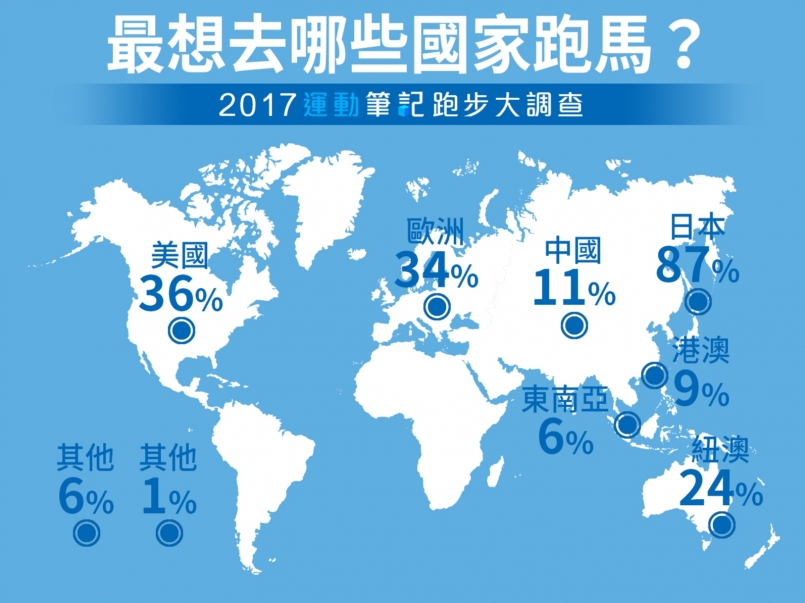 在今年的大調查中,有 16% 的跑友於 2017 年有參加海外賽事的經驗,而參加賽事國家為日本者比例高達 79%;不僅如此,談到未來最想要前往哪些國家參加賽事(可複選),日本也是獨佔鰲頭,高達 87%,其次才是美國 36% 與歐洲 34%;而南半球的紐澳則有 24%。