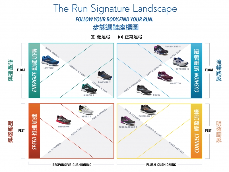 以「RUN HAPPY」為品牌精神的 BROOKS,希望各種不同程度的跑者都能透過他們的高科技鞋款,在跑場上盡情馳騁。也因此,根據不同跑者的需求,BROOKS 的鞋款分為四大象限之外,每一個象限都還貼心的依據足弓程度不同,分成一般足弓至低足弓與扁平足弓需求的「支撐型」,及一般跑者至高足弓所需求的「平穩型」,同時對應到跑者不同時期會有的各階段目標,徹底實現「RUN HAPPY」: