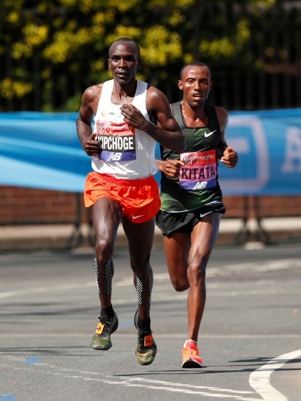 25公里後 Bekele 和 Karoki 先後退出領先集團,Farah 則在 30 公里處落隊,Kipchoge 與 Kitata 以 1:27:24 通過 30k,到此為止也正式把開賽 pacer「好心」預存的時間花完,配速掉出世界紀錄之外,並開始顯露疲態,接下來的五公里是整場比賽最慢的,兩人仍盡力守住領先位置,但相較之下 Kitata 的動作已經開掉,不若 Kipchoge 的節奏穩定。
