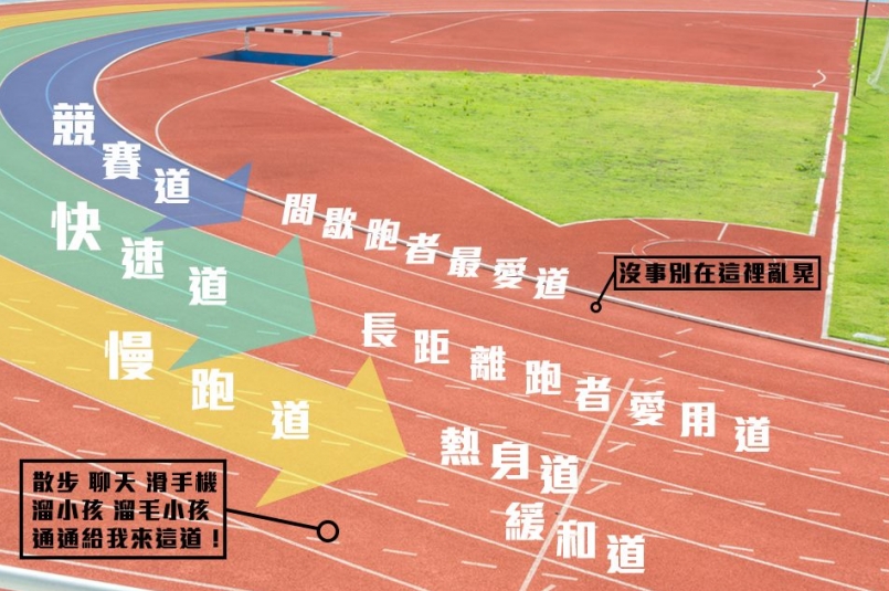 跑步的人越來越多,使用操場的人也越來越多了!非常樂見大家再也不是下班回家當沙發馬鈴薯,但畢竟跑道是設計給跑步的人使用的,在共享跑道時,請各方朋友都了解一下跑道的使用規則,讓大家都能和平運動。