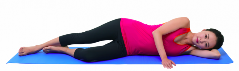 | 1 左側躺,左手彎曲枕在頭下方,右手於身體前方撐地,左腳稍微彎曲使身體固定不動。 |